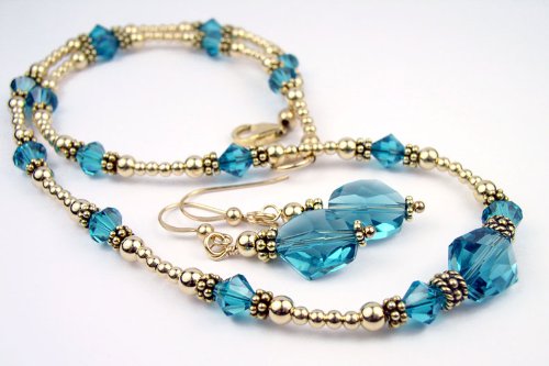 Blue Zircon - December, Blue Zircon - December Birthstone Necklace - Gold Filled/Vermeil Swarovski Crystal Beaded Necklaces. A dazzling Swarovski Austrian Crystal Beaded Necklace in an all new COSMIC Swarovski Crystal Cut! Sleek, smooth, sophisticated. These Handmade Beaded 2 Piece Necklace and Earrings Sets are handcrafted with 100% genuine Swarovski Austrian crystals, 14k Gold Filled and Vermeil accents. Nothing can compare with the sparkle and dazzle of genuine Swarovski Austrian Crystals! GemstoneGifts Handmade Jewelry is handcrafted one at a time in our New Jersey USA Studio by jewelry artist Shirley L. Gordon.